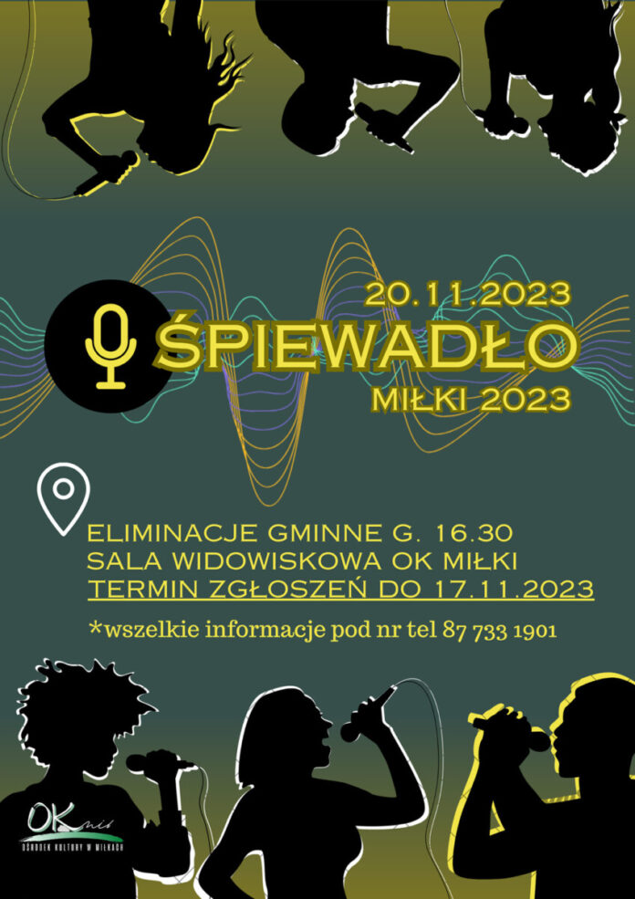 Serdecznie zapraszamy na eliminacje gminne XXV Przeglądu wokalnego solistów, zespołów dziecięcych i młodzieżowych oraz muzykujących rodzin pt. Śpiewadło, które odbędą się 20 listopada 2023 r. (poniedziałek) o godz. 16.30 w sali widowiskowej Ośrodka Kultury w Miłkach. Zgłoszenia do 17.11.br.