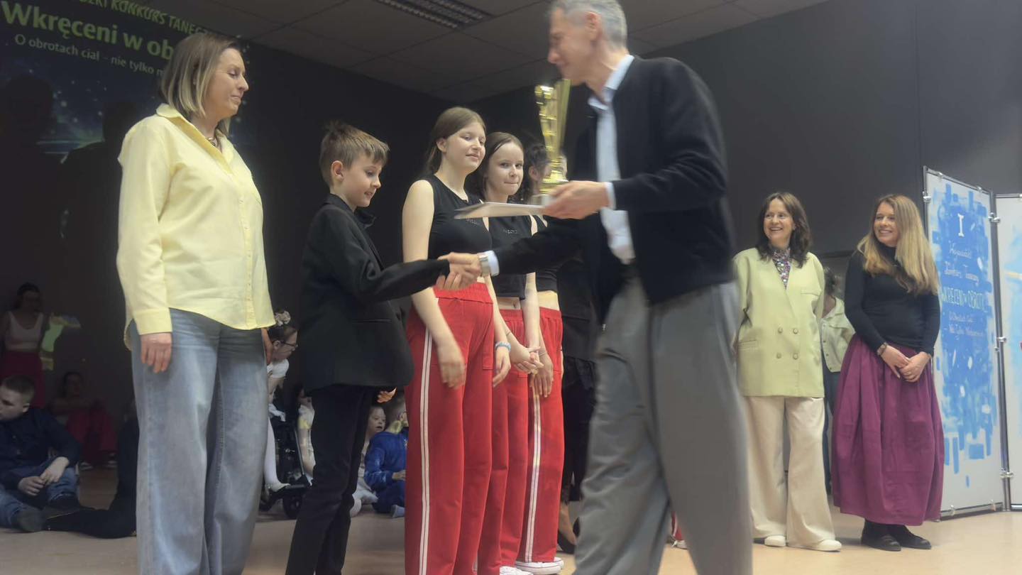 15 kwietnia br. na zaproszenie Specjalnego Ośrodka Szkolno-Wychowawczego w Olsztynie Zespół Taneczny „PASJA” ze Specjalnego Ośrodka Szkolno-Wychowawczego im. J. Brzechwy w Giżycku wziął udział w I Wojewódzkim Konkursie Tanecznym „Wkręceni w Obroty… O Obrotach Ciał – Nie Tylko Niebieskich”, zdobywając zaszczytne 3 miejsce wśród 12 zespołów. Rangę tego osiągnięcia podkreśla obecność gościa specjalnego oraz członka jury – Pani Iwony Pavlović, co czyni ten sukces szczególnie doniosłym.