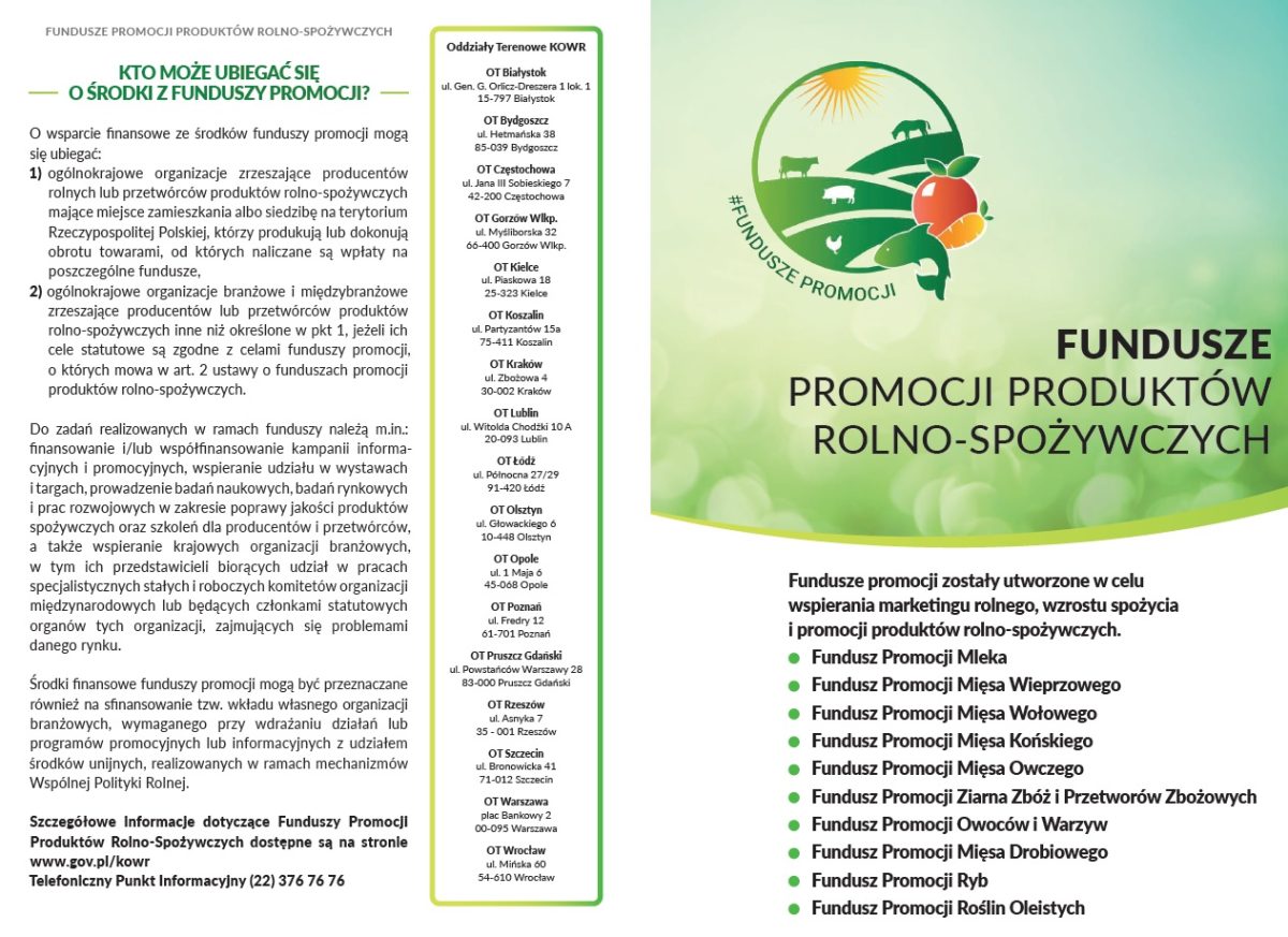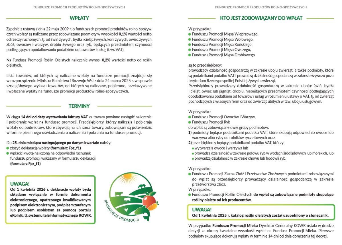Krajowy Ośrodek Wsparcia Rolnictwa informuje, iż w związku z nowelizacją ustawy o funduszach promocji produktów rolnospożywczych (Dz. U. z 2025 r. poz. 683) od 1 kwietnia 2026 r. wprowadzony został obowiązek składania deklaracji wpłat na fundusze promocji produktów rolno-spożywczych, wyłącznie za pośrednictwem systemu teleinformatycznego KOWR tj. poprzez platformę usług eRolnik: https://erolnik.gov.pl