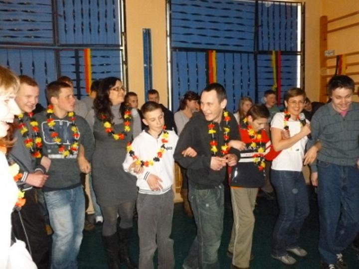 Dnia 22 lutego 2012r. kolorowy Deutsch Wagen odwiedził Ośrodek Szkolno-Wychowawczy im. Jana Brzechwy w Giżycku. Przy tej szarej pogodzie musiał wyróżniać się na zaśnieżonym horyzoncie i już z daleka witał serdecznie uczniów tej szkoły przywożąc ze sobą dobry nastrój i dużo dobrego humoru. Pani lektor języka niemieckiego spotkała się najpierw z najmłodszymi uczniami, którzy w zabawie z balonami mogli nauczyć się niemieckich słówek określających części ciała. Przysporzyło to wszystkim wiele radości i było dobrym wstępem do zabaw z chustą animacyjną.