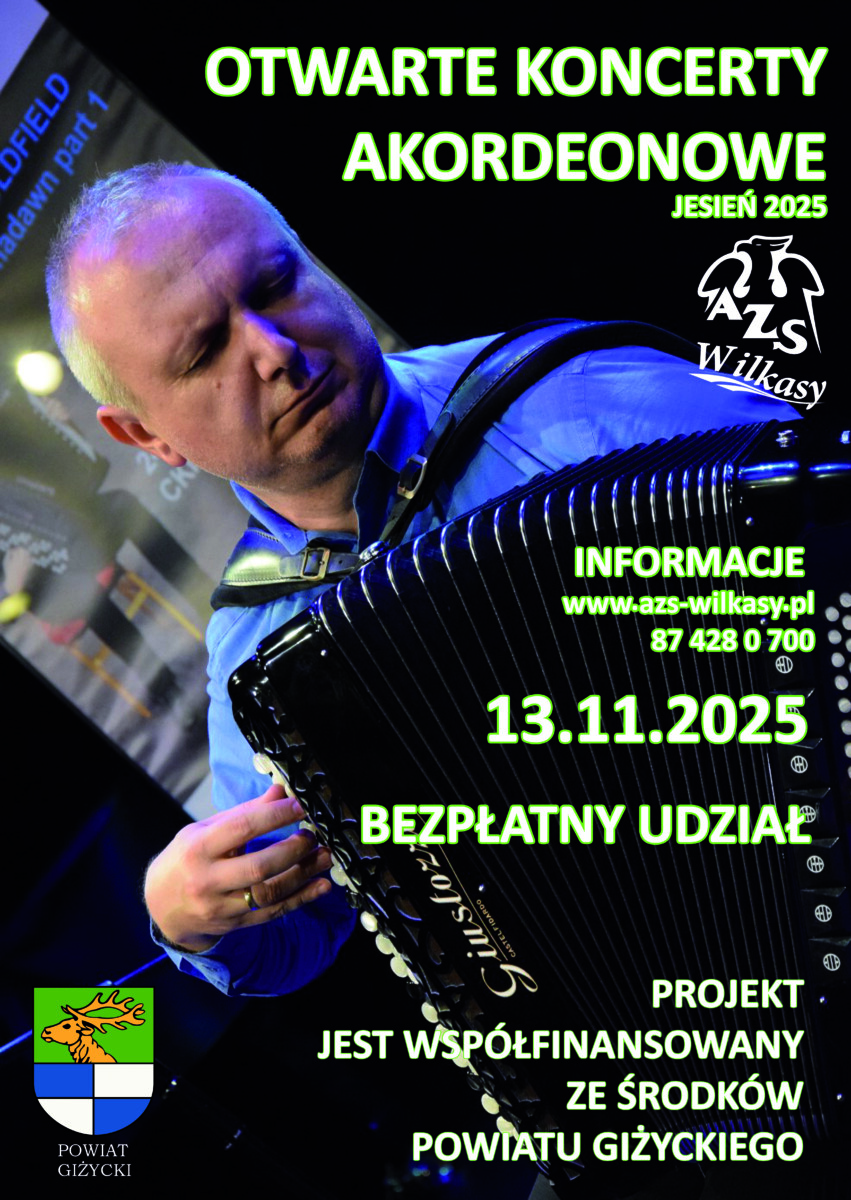 Akademicki Związek Sportowy COSA Oddział w Wilkasach zaprasza na Otwarty Koncert Akordeonowy – nowy projekt AZS Wilkasy realizowany dzięki wsparciu ze środków budżetowych Powiatu Giżyckiego.