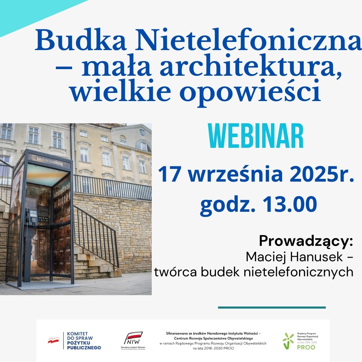 Związek Stowarzyszeń LGD9 zaprasza na webinar pt. „Budka Nietelefoniczna – mała architektura, wielkie opowieści – case study z pogranicza sztuki, przestrzeni miejskiej i partycypacji społecznej”, który odbędzie się 17 września 2025 r. o godz. 13.00.